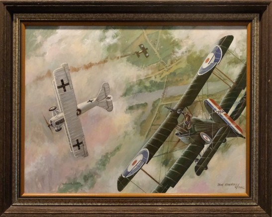 This painting depicts Canadian ace William “Billy” Bishop VC in his SE5a engaging Herman Goering in his white Fokker D.VII.